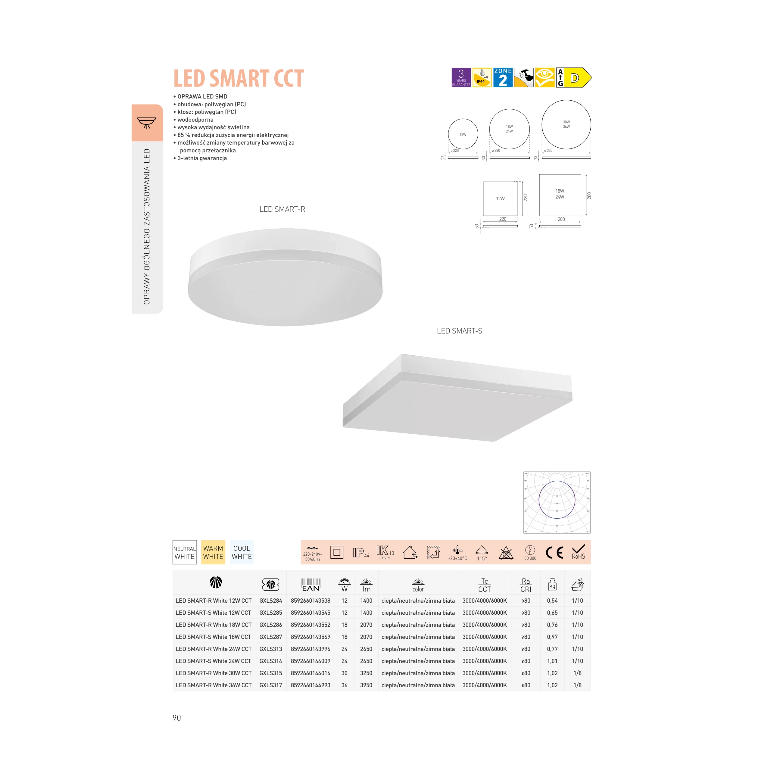 OPRAWA LED SMD CCT• obudowa: poliwęglan (PC)• klosz: poliwęglan (PC)• do wszechstronnego zastosowania zarówno w obszarach mieszkalnych, jak i technicznych - na przykład jako oprawa centralna w mniejszym pomieszczeniu.• trwała, odporna na promieniowanie UV konstrukcja z poliwęglanu umożliwia również stosowanie na zewnątrz.• łatwy montaż oprawy zapewnia uchylny wspornik montażowy oraz bezśrubowy blok zaciskowy.• natynkowa o nowoczesnym designie i podwyższonej odporności na kurz i wodę (IP: 44). • wysoka wydajność świetlna (115lm/W)• 85 % redukcja zużycia energii elektrycznej• możliwość zmiany temperatury barwowej za pomocą przełącznika• średni czas życia oprawy wynosi 30 000 godzin.• 3-letnia gwarancja