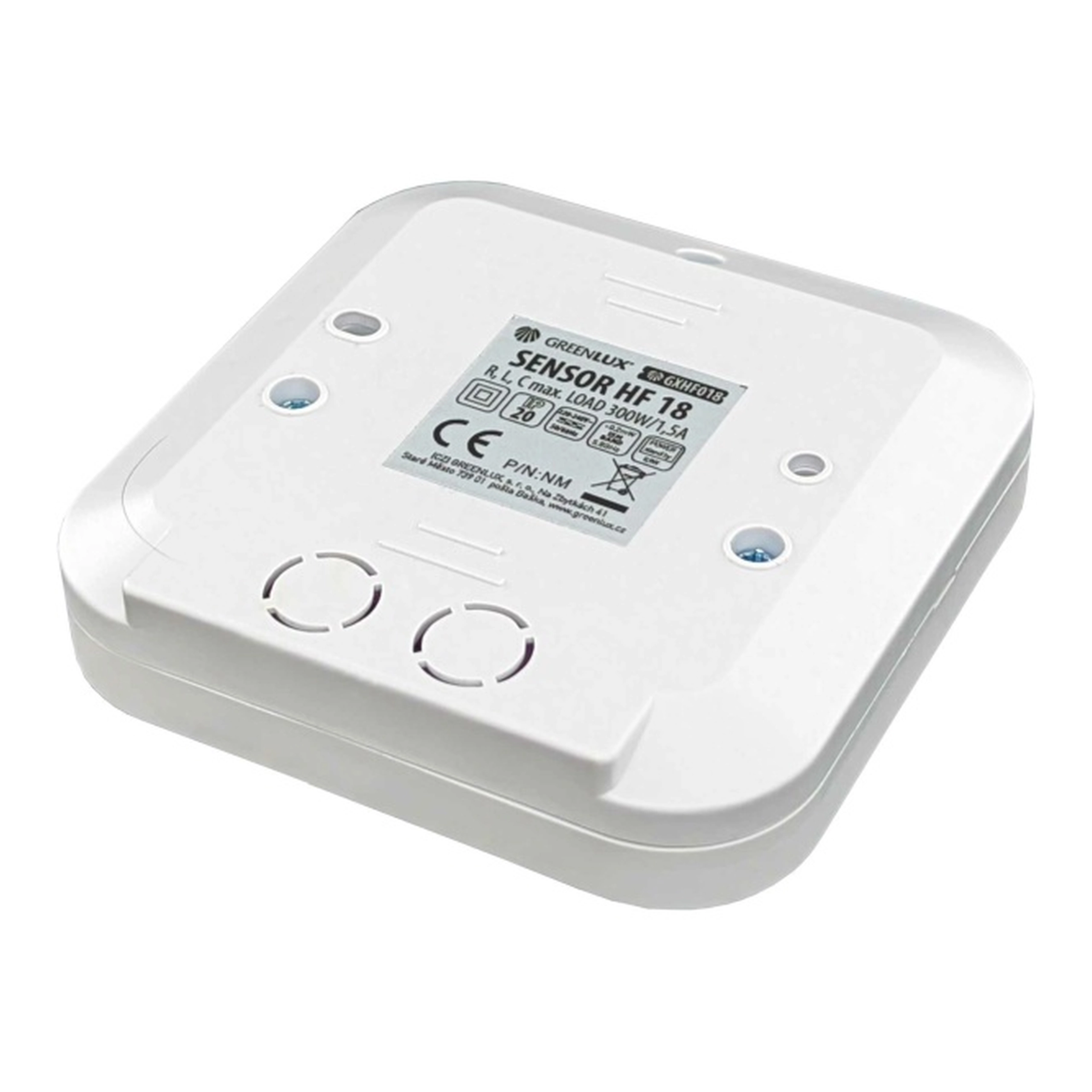 Parametry Znak towarowy: Greenlux Napięcie nominalne [V]: 220-240 Częstotliwość znamionowa [Hz]: 50/60 Moc maksymalna [W]: 800 Element przełączający: RELAY Stopień ochrony IP: IP20 Klasa ochrony porażeniowej: II Zasięg wykrywania czujnika [m]: 12 Minimalny czas działania [s]: 10 Maksymalny czas działania [min]: 12 Kąt widzenia czujnika [°]: 360x180 Temperatura pracy Ta (Zakres): -20+50°C Kolor: biała Zalecana wysokośc montażu [m]: 2-6 Montaż na podłożu normalnie palnym: tak ETIM EG - grupa: EG000013 ETIM EC - klasa: EC000133 Szerokość [mm]: 90 Wysokość [mm]: 26,8 Długość [mm]: 90 RoHS: tak Znaki zgodności: CE