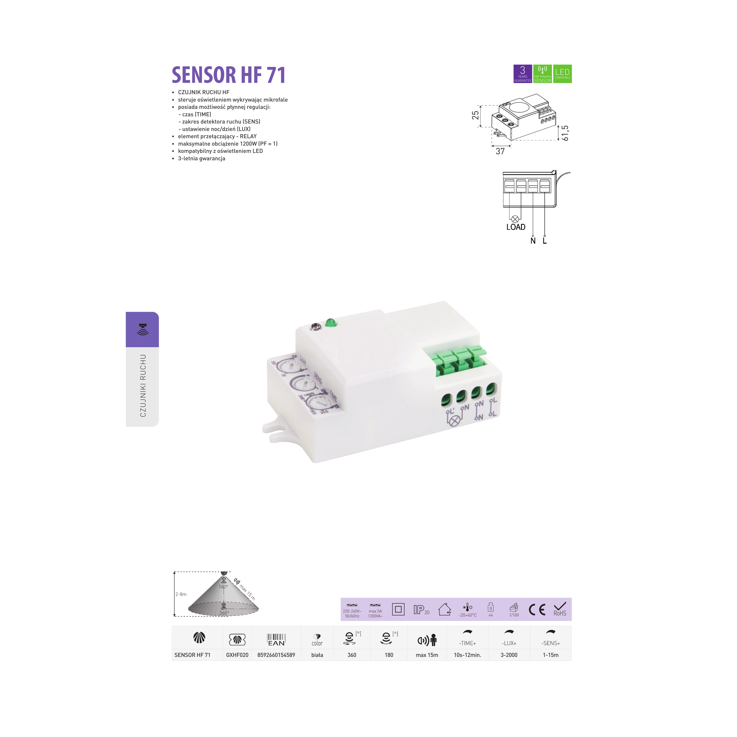 Czujnik ruchu HF wbudowywany PIR SENSOR HF 71 do lamp i oświetlenia LED