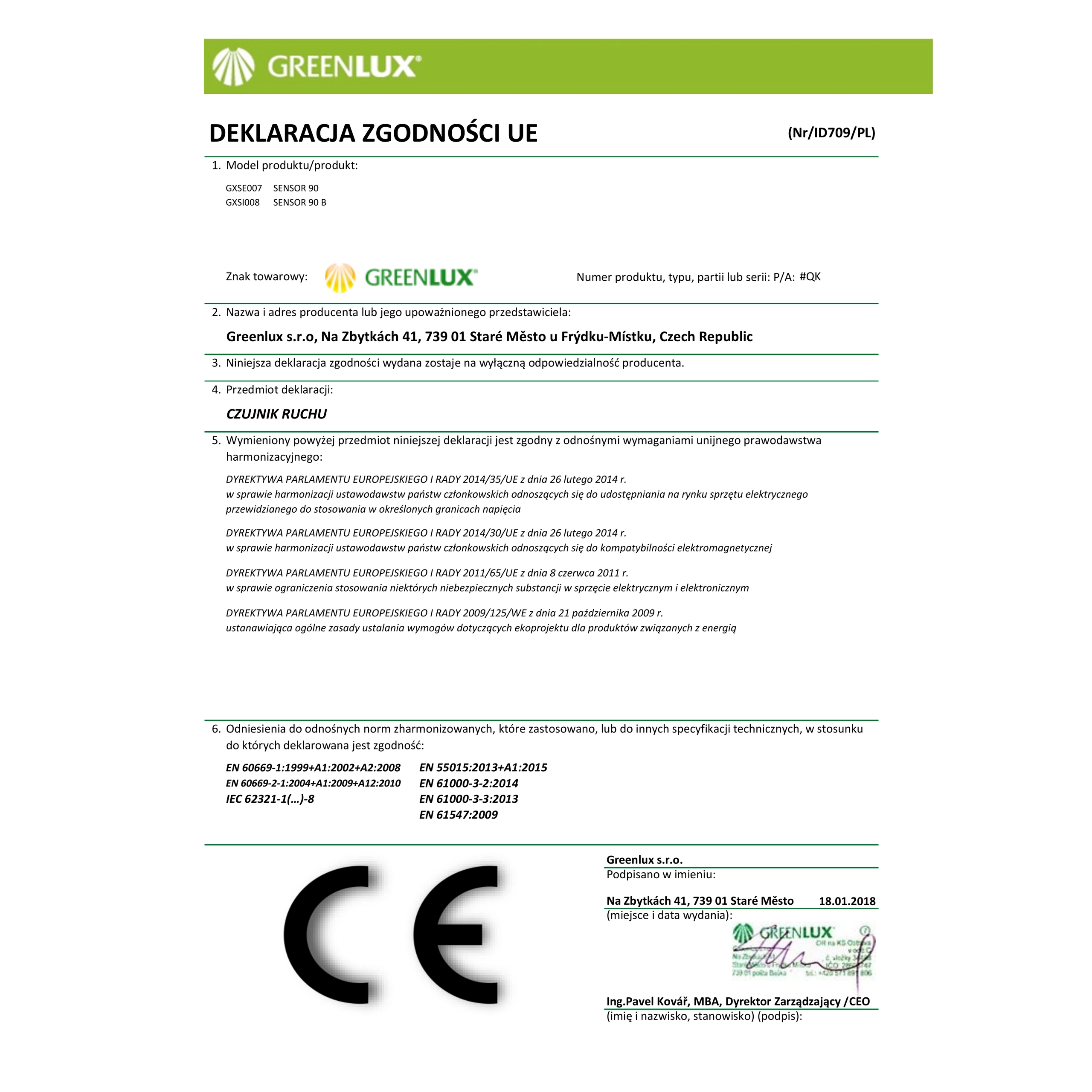 Parametry Znak towarowy: Greenlux Napiecie nominalne [V]: 220-240 Częstotliwość znamionowa [Hz]: 50/60 Moc maksymalna [W]: 800 Element przełączający: RELAY Stopień ochrony IP: IP44 Klasa ochrony porażeniowej: II Zasięg wykrywania czujnika [m]: 12 Minimalny czas działania [s]: 10 Maksymalny czas działania [min]: 15 Kąt widzenia czujnika [°]: 180x120 Temperatura pracy Ta (Zakres): -20+40°C Kolor: czarny ETIM EG - grupa: EG000013 ETIM EC - klasa: EC000133 Waga [g]: 100 Próg działania - tryb nocny / dzienny: 3-2000 LUX RoHS: tak Znaki zgodności: CE