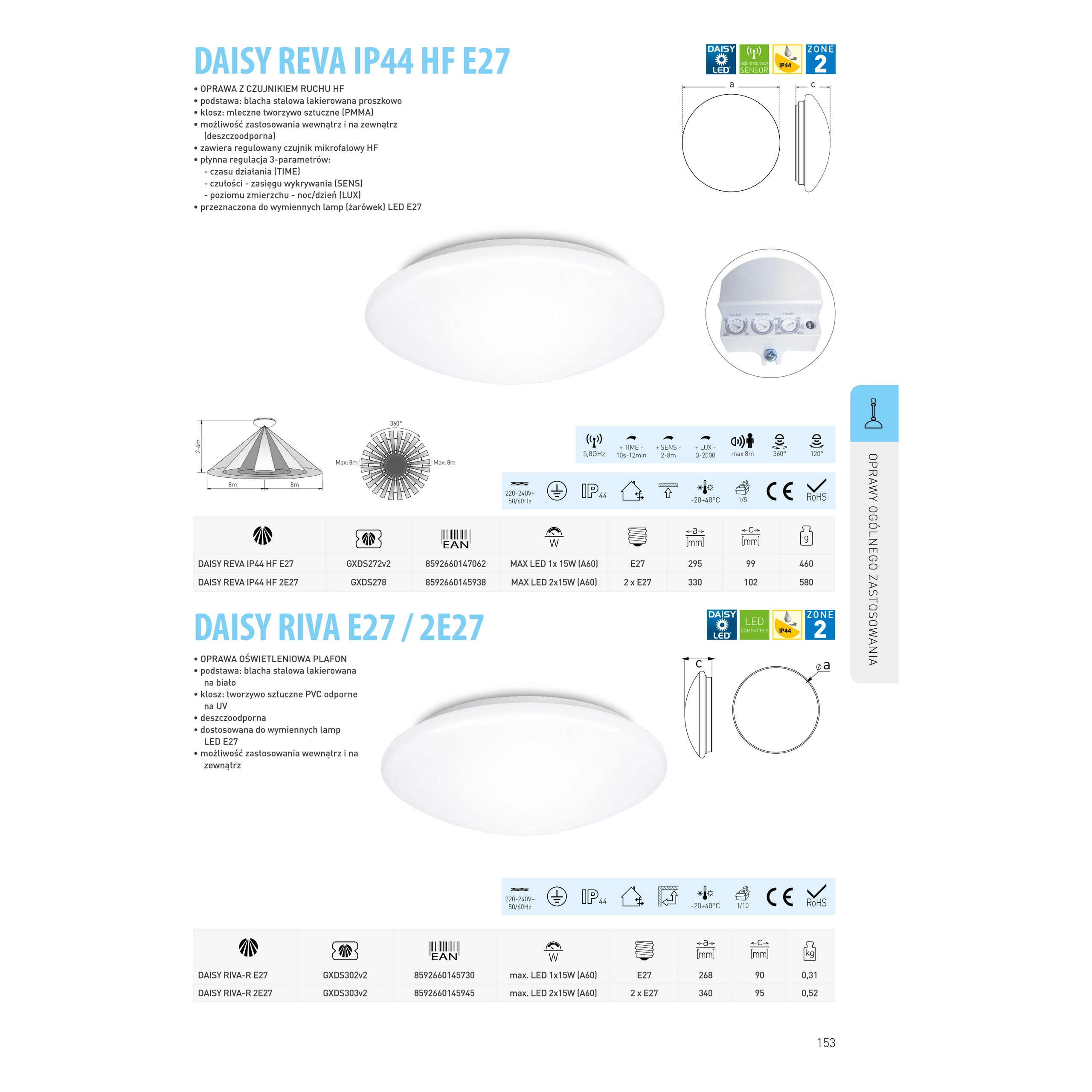 Daisy LED DAISY REVA IP44 HF E27 - Oprawa E27 z czujnikiem ruchu HF to oprawa LED, który łączy estetykę z oszczędnością energii — komfortowe, równomierne światło na co dzień.