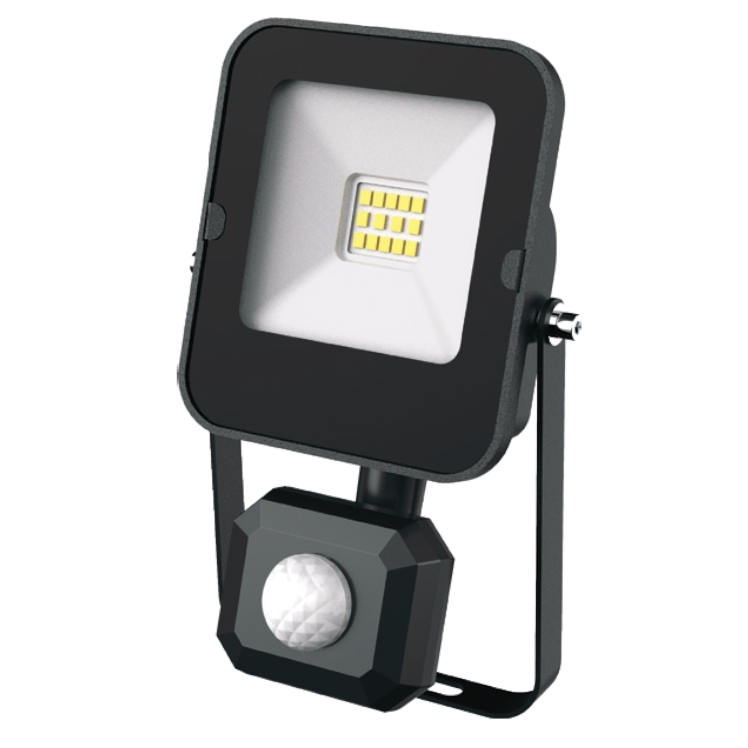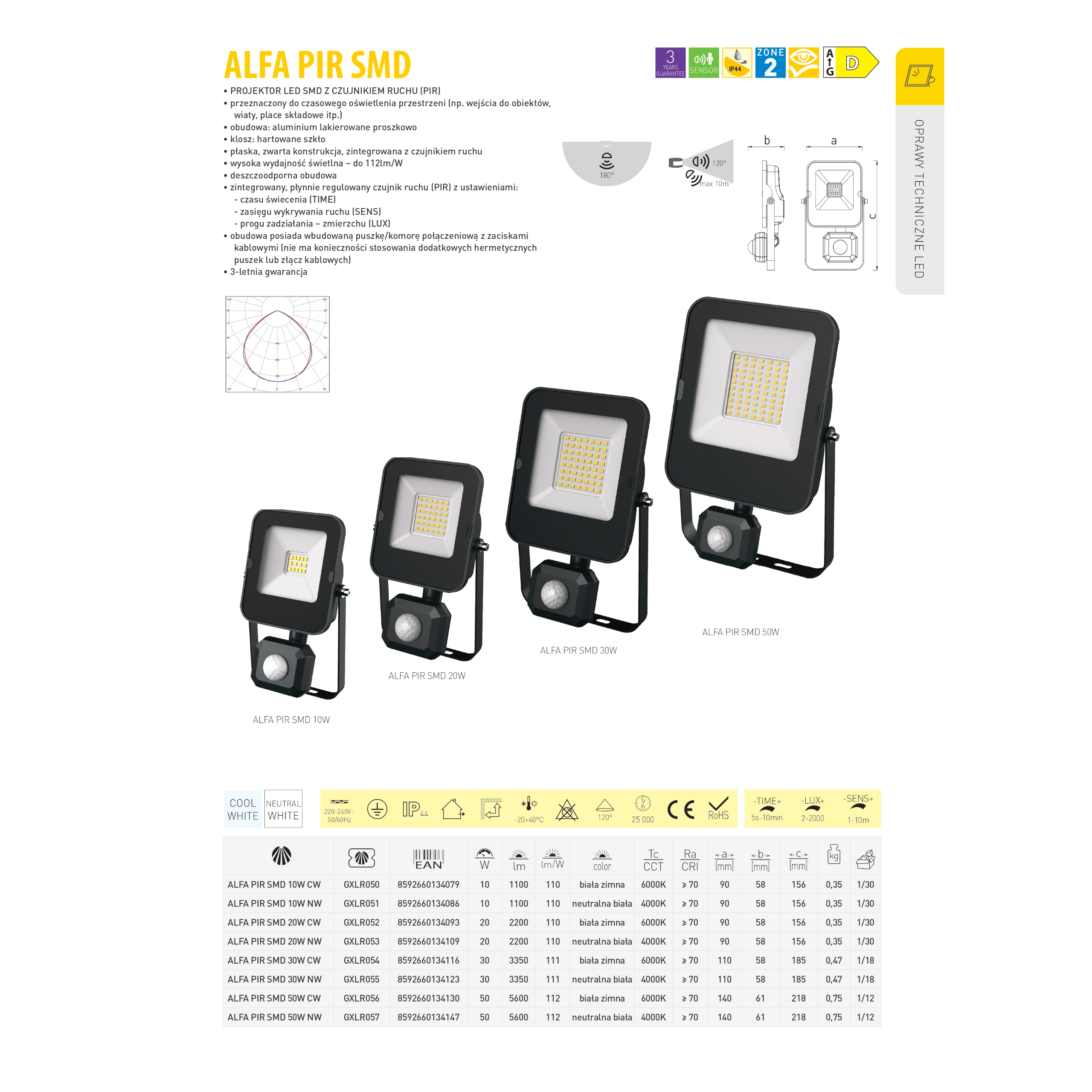 REFLEKTOR LED SMD Z CZUJNIKIEM PODCZERWIENI (PIR)·Korpus oprawy wykonany jest z lakierowanego na czarno aluminium·Dyfuzor - odporne hartowane szkło·Przeznaczony do tymczasowego oświetlenia zewnętrznego i wewnętrznego, Reflektor włącza się automatycznie po zarejestrowaniu ruchu w wykrywanym obszarze czujnika, zgodnie z jego ustawieniami.·Wszechstronny w instalacjach domowych i inwestycyjnych, na przykład do oświetlania chodników, wejść, wokół domów itp.·Płaska, kompaktowa konstrukcja·Wysoka skuteczność świetlna 110 lm / W.·Pyłoszczelna i wodoodporna konstrukcja pozwala na użytkowanie w środowisku zewnętrznym.·Oprawa zawiera łatwo dostępny blok zacisków (przewody o maksymalnym przekroju 3 x 1,5 mm2), który oszczędza nie tylko czas m