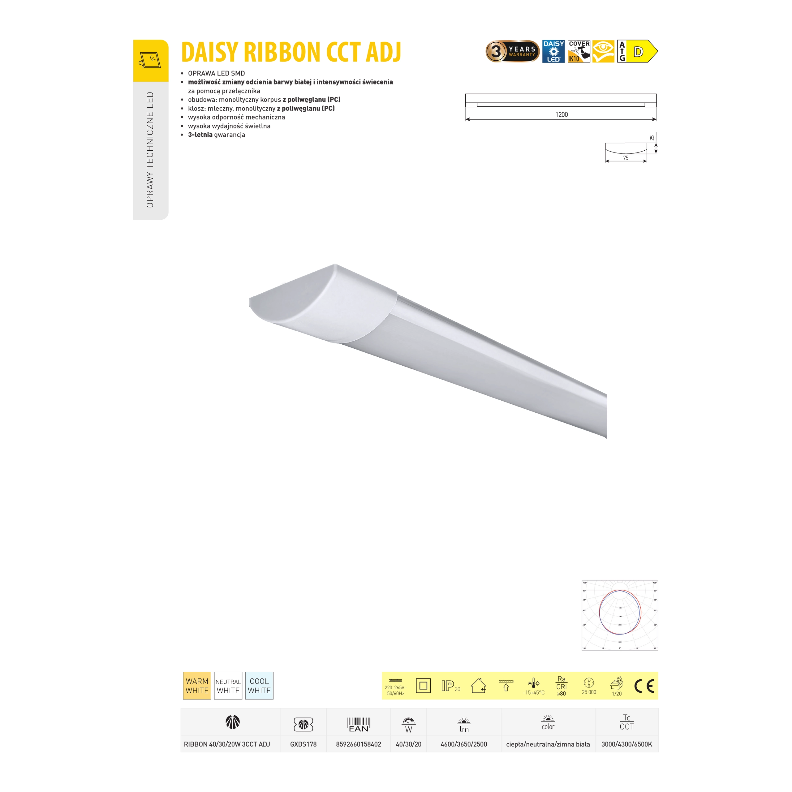 Dzięki możliwości regulacji mocy (40W / 30W / 20W) oraz technologii 3CCT, użytkownik może dostosować zarówno intensywność, jak i barwę światła (3000K / 4300K / 6500K) do konkretnego zastosowania.