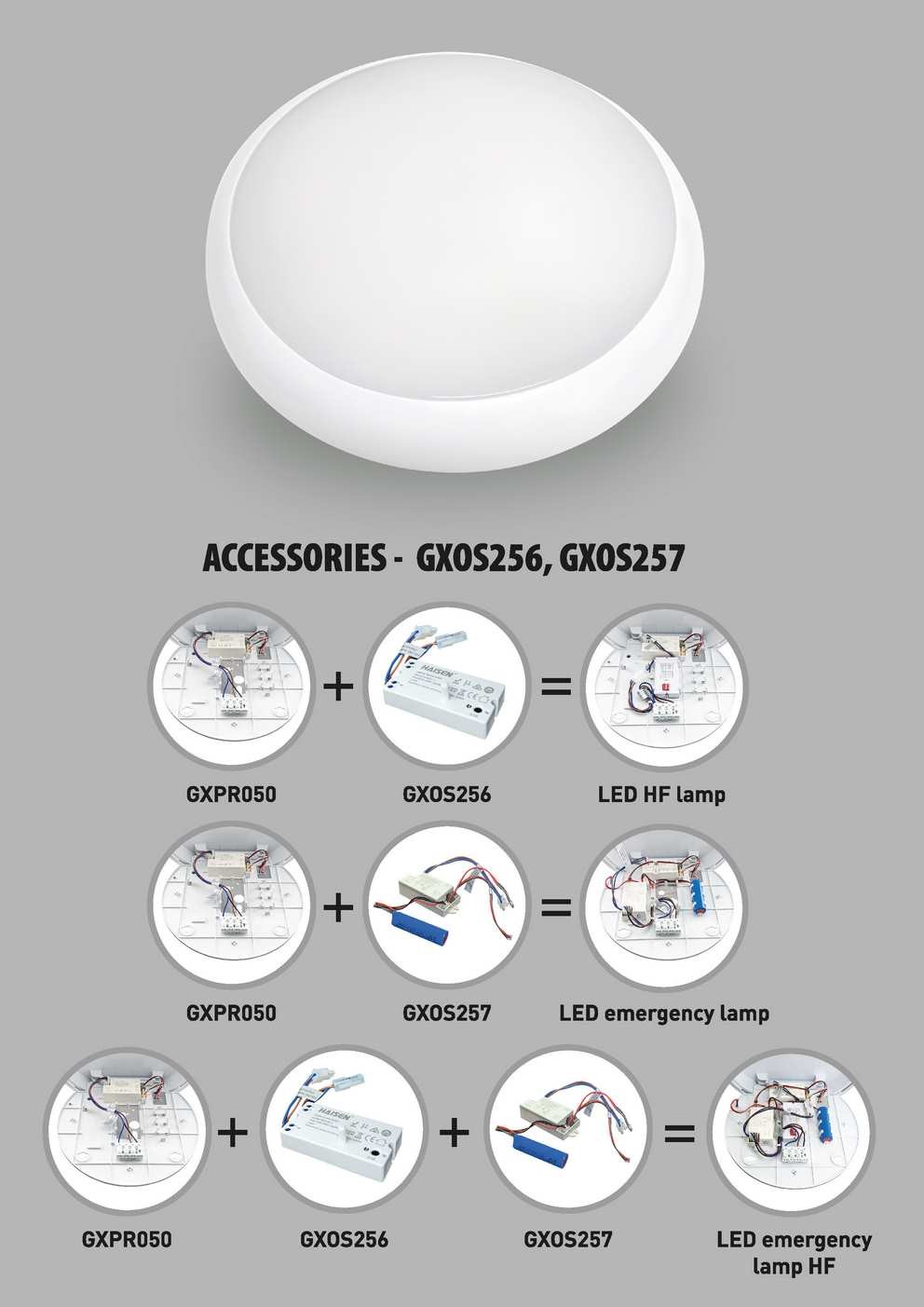 OPRAWA LED SMD• obudowa: poliwęglan (PC)• klosz: poliwęglan (PC)• możliwość przełączania odcienia białej barwy świecenia i mocy• wodoodporna i pyłoodporna obudowa• wysoka wydajność świetlna – do 116lm/W• łatwa konfiguracja i rozbudowa wyrobu o dodatkowe funkcje• 5-letnia gwarancja• kupując oddzielne, dedykowane akcesoria GXOS256/GXOS257 można stworzyć następujące warianty produktu:1. GXPR050 + GXOS256 - oprawa z mikrofalowym czujnikiem ruchu (HF)2. GXPR050 + GXOS257 - oprawa z zasilaniem awaryjnym3. GXPR050 + GXOS256 + GXOS257 - oprawa z mikrofalowym czujnikiem ruchu (HF) i zasilaniem awaryjnym