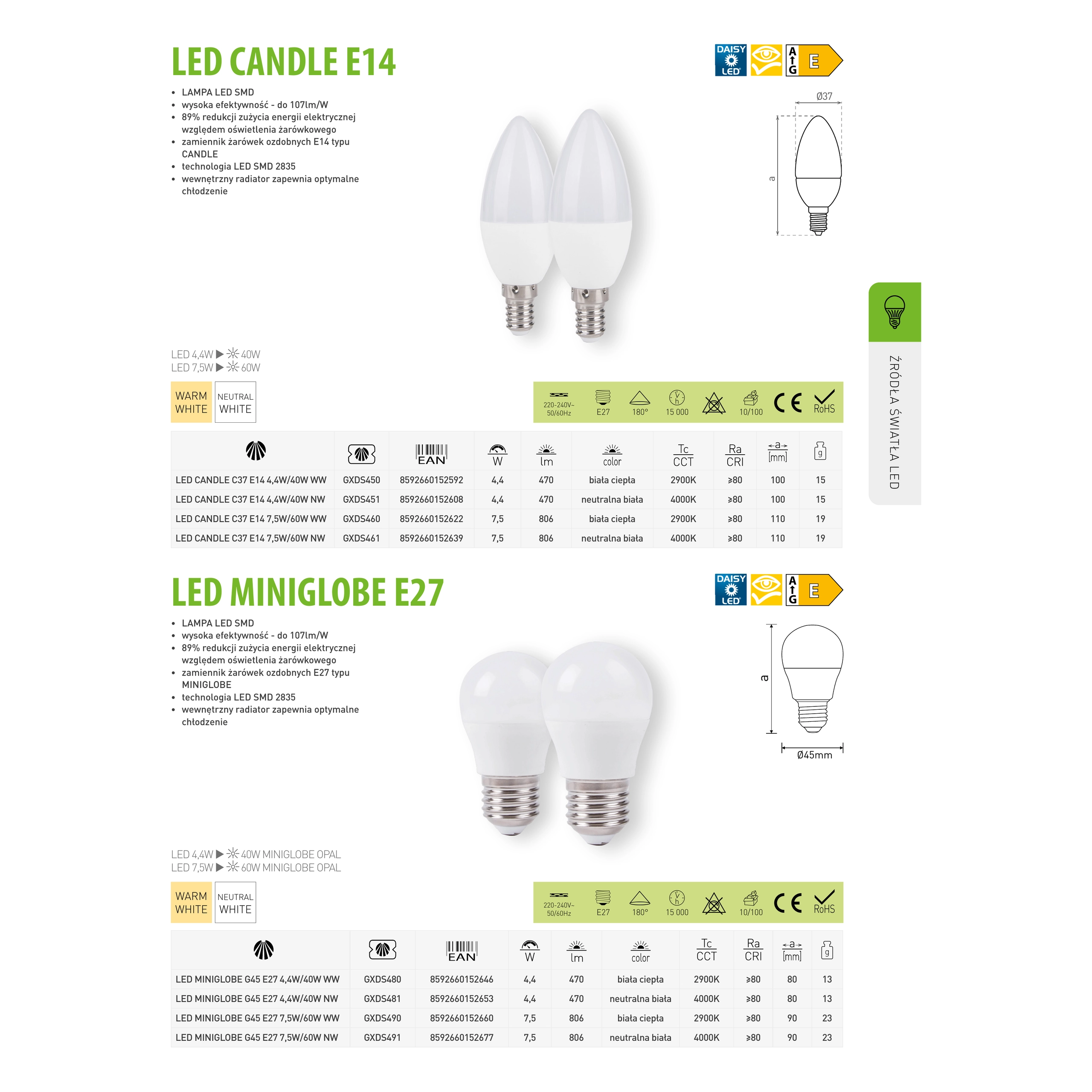 - Model: LED CANDLE C37 E14 7,5W/60W NW